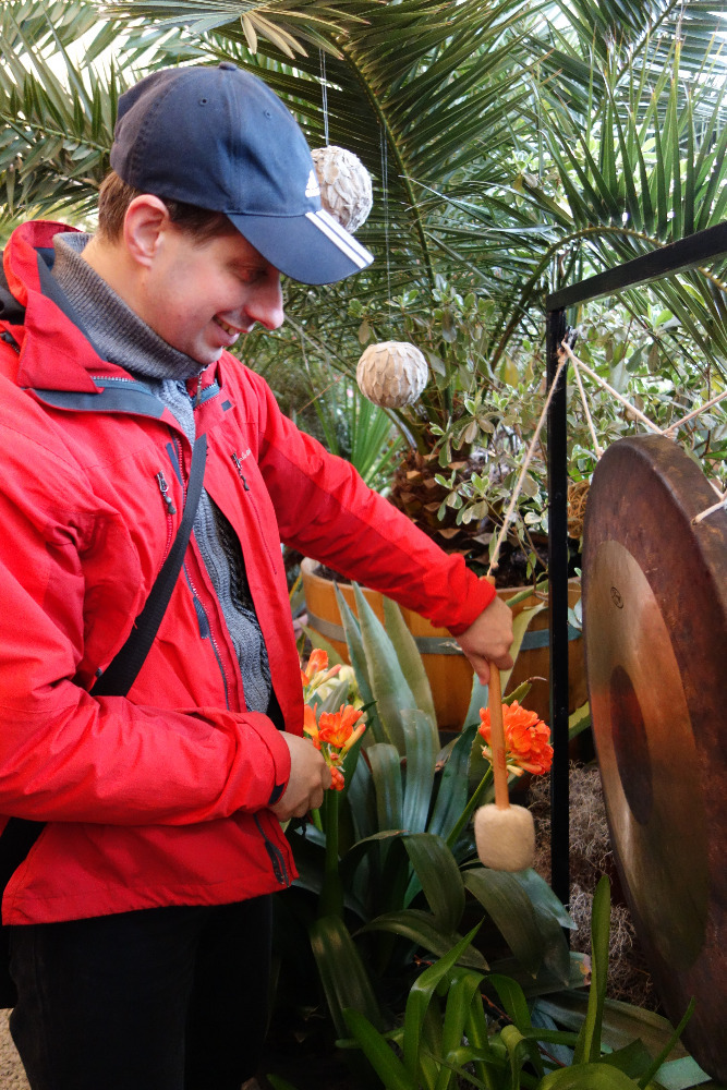 Ve Velkém skleníku jsme přičichli k již poslednímu vonícímu květu kamélie. Element oheň - tedy určitou dynamiku, nadšení tady znázorňovali roztomilí a neustále skřehotající červeno-žluto-zelení papoušci rodu Agapornis. Element vody zase zastupovalo černé jezírko s kapry koa. Připadali jsme téměř jako v tropickém deštném lese. Všude okolo nás bylo tolik oku lahodících cizokrajných květin. Kromě kamelií byly v hojné míře zastoupeny nejrůznější pestrobarevné orchidee, amarylis, palmy ajj. Zjistili jsme jak vlastně voní i jak drobný květ má pravý jasmín. Prošli jsme pod branou ozdobenou nejrůzněji zakroucenými tykvemi. Během našeho pohybu po skleníku jsme mohli vnímat také různé povrchy země. Chvilku jsme šli po oblázcích, kůře, dřevě i po písku. Na závěr prohlídky jsme udeřili na zvučný gong pro splnění přání, která se nám třeba i vyplní. Výstava kamélií byla velmi pěkná a harmonická. Skleníky vytváří takovou oázu klidu a odpočinku od shonu všedních dní.