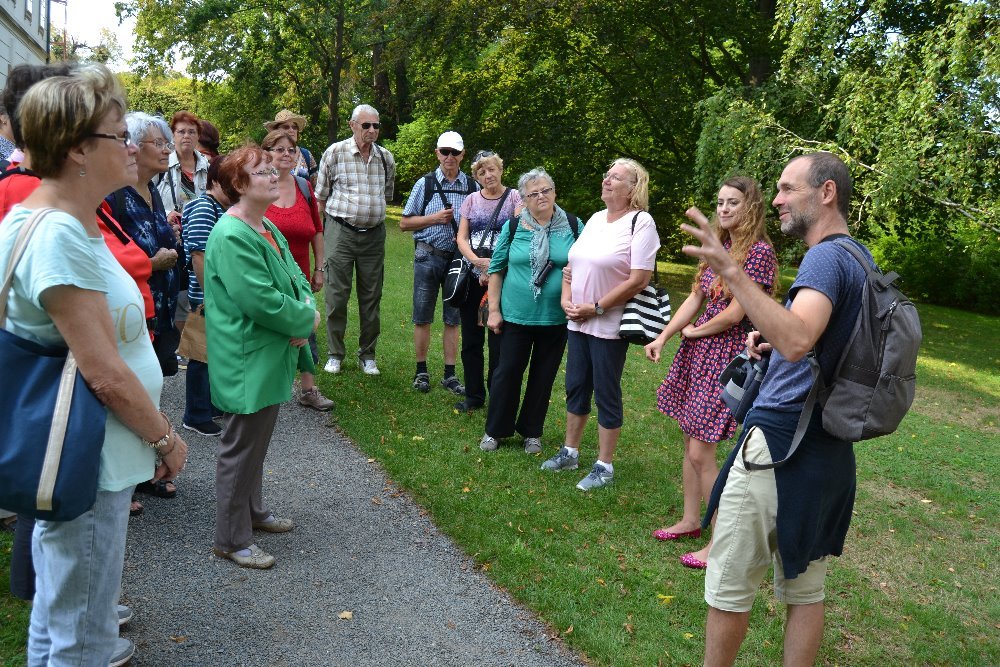 Odpoledne po obědě jsme se s panem Hudcem vydali na prohlídku zámeckého parku. Park má přírodně krajinářskou podobu a je doplněný sochami svatých, u zámku dvěma sochami gladiátorů. Park díky členitému terénu působí romanticky. Obzvlášť když jsme se alejí sestřižených stromů dostali do otevřeného parku s jezírkem. Stáli jsme v údivu nad okouzlujícím výhledem na menší údolí, ve kterém se jezírko nachází.