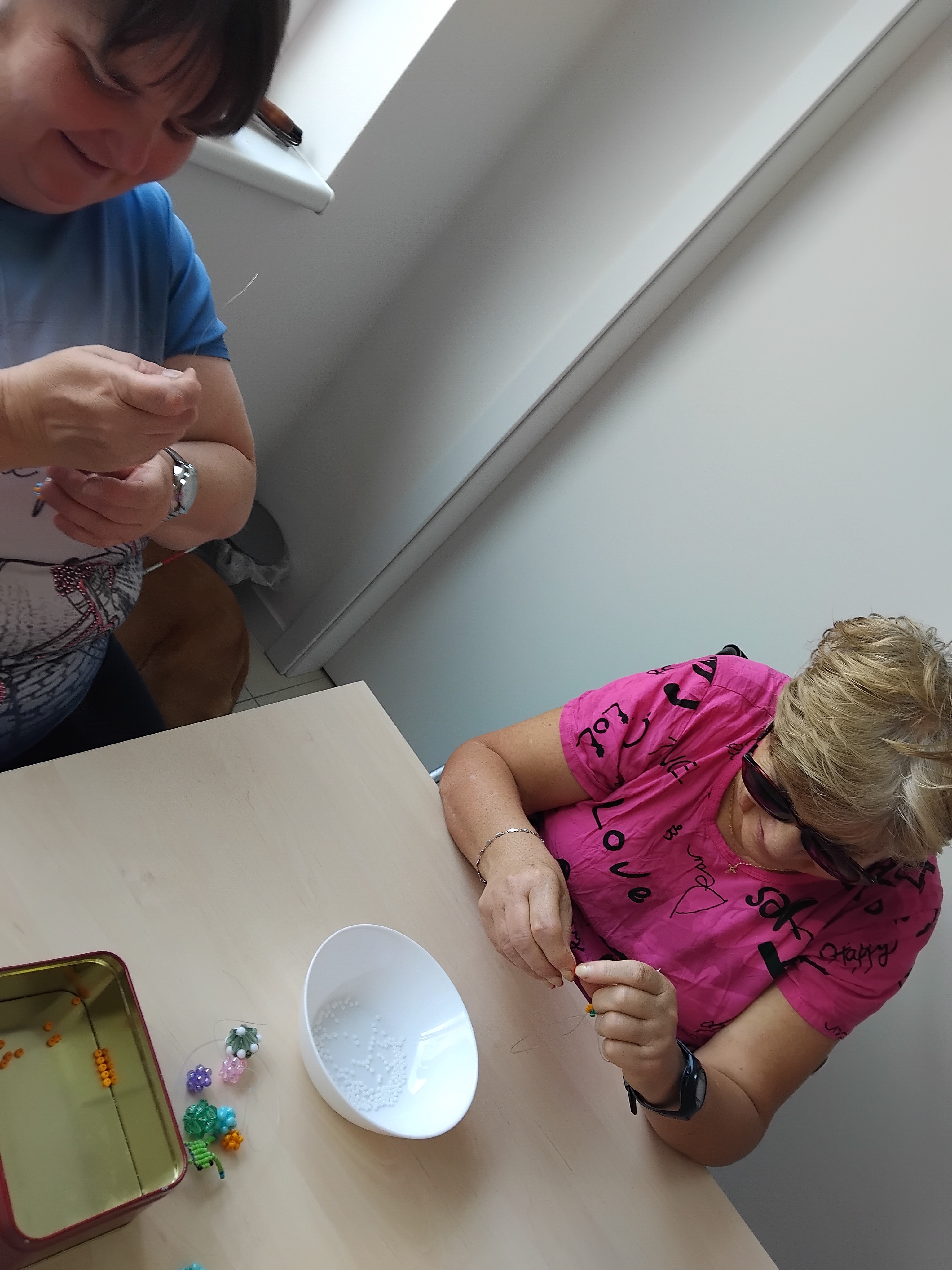 Po úspěšné výrobě korálkové kuličky z minula jsme se tentokrát pustili do tvorby zvířátek – konkrétně vážky. Účastníci se s nadšením chopili práce a ukázalo se, že tvorba složitějších tvarů je pro všechny zajímavou výzvou. Těší nás, že i lidé se zrakovým postižením se do aktivity aktivně zapojují – jejich odhodlání a tvořivost jsou pro nás všechny inspirací. Zpětná vazba byla velmi pozitivní. Účastníky práce s drátky a korálky baví, a tak už teď plánujeme další setkání. Příště nás čeká výroba žáby a pro lepší pochopení techniky připravíme i nácvik na kaničkách. Ten pomůže názorněji představit, jak správně ohýbat a motat jednotlivé drátky – což ocení zejména ti, kteří si vizuální podobu tvořeného objektu nemohou sami prohlédnout.