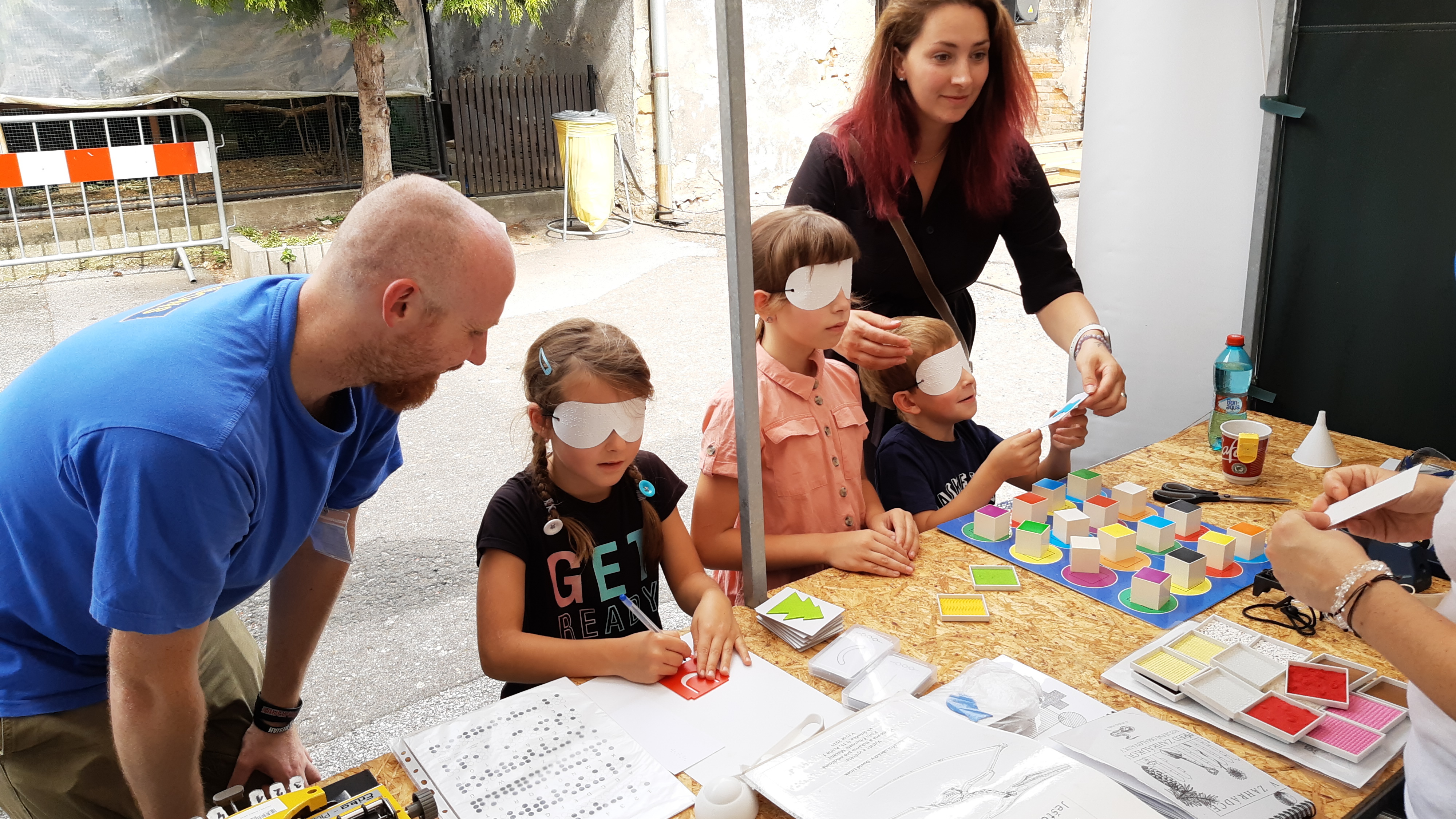 Náš stánek byl umístěn nedaleko vstupní brány, a proto nemohl zůstat bez povšimnutí. Pozornost dětí poutaly barevné balónky s logem organizace SONS, a tak děti s chutí přicházely zkoušet své dovednosti bez užití zraku. Hádaly obrázky hmatem, nalévaly vodu, hrály zvukové pexeso a poznávali povrchy hmatového pexesa. Velkým hitem byla opět zvuková střelba, která zaujala i starší návštěvníky.