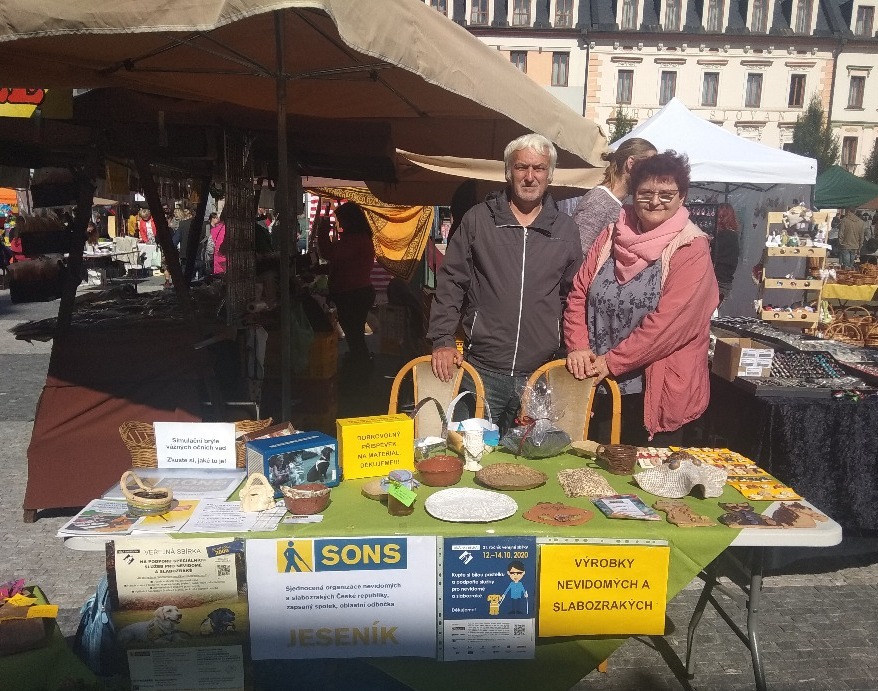 Středu 2. 9. jsme zahájili klubem vaření, kde jsme pečlivě připravili spoustu jednohubek na vernisáž výstavy, na kterou jsme se potom společně vypravili. V dalším středečním klubu jsme si zahráli stolní hry a společně si povídali. Máme radost z každého společného setkání a sdílení s vámi! Předposlední středeční klub patřil prezentační akci firmy Adaptech. Pan Kavan nás seznámil s novinkami v jejich elektronických optických pomůckách, zodpověděl četné dotazy a pomohl s nastavením mobilního telefonu. V posledním klubu jsme si společně uvařili různé dobroty z jablek. V pátek 18. 9. přálo počasí a mohli jsme se zúčastnit farmářských trhů. Díky pomoci tří našich členů mohla mít i naše odbočka informační a propagační stánek na jesenickém náměstí. Nabízeli jsme informační letáky o našich službách a činnosti, ale také výrobky z klubu tvoření (bylinkové pytlíky – s mátou, meduňkou, levandulí, lípou a také s kořením – oreganem a libečkem), dále zdobené květináče se sazeničkami fialek, rýmovníku a muškátu a také výrobky z keramiky.