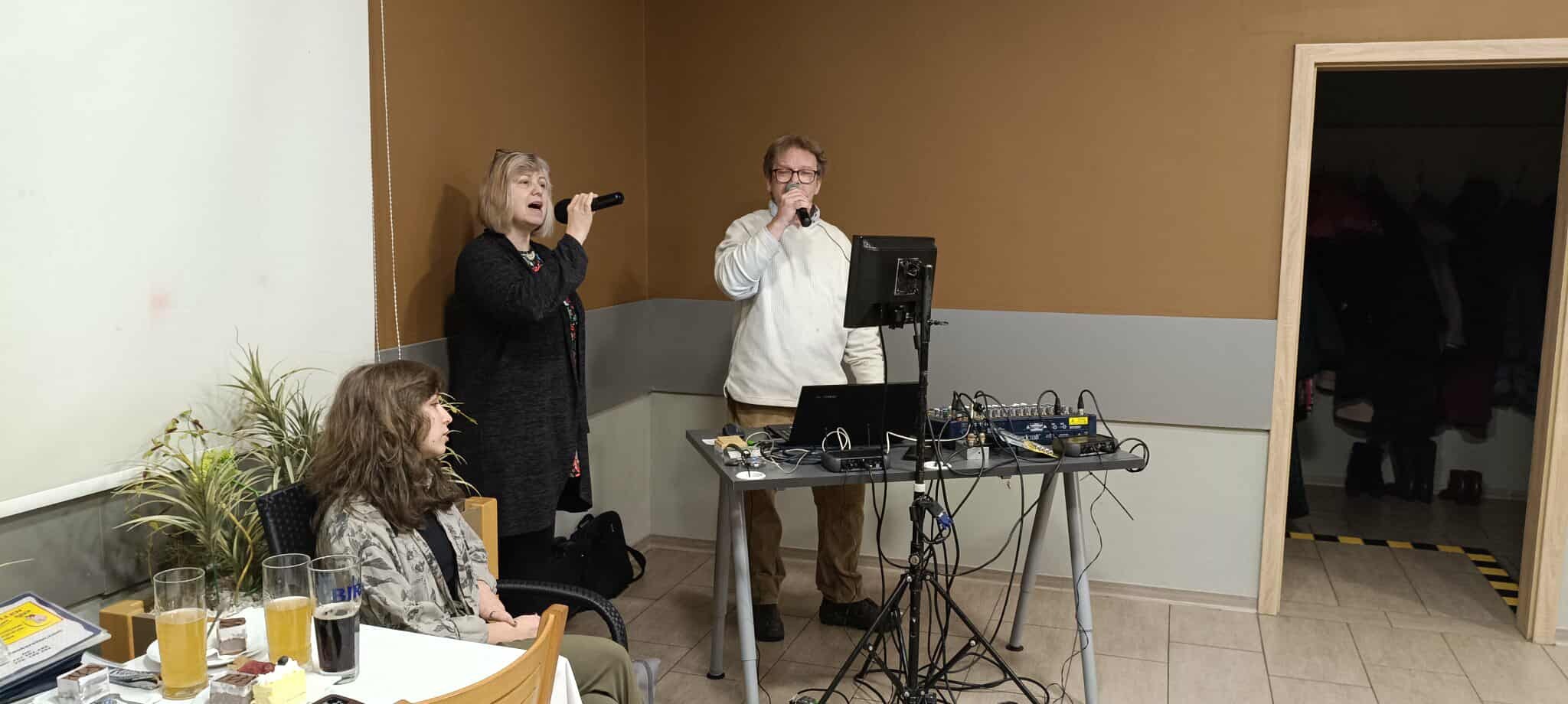 Popis fotografie: V místnosti stojí dva lidé a zpívají do mikrofonů. Před sebou mají obrazovku na stojanu, sledují text písně. Na stole před nimi je zvuková technika – mixážní pult a kabely. U jiného stolu sedí další člověk a pozoruje je; na stole je několik sklenic s nápoji.