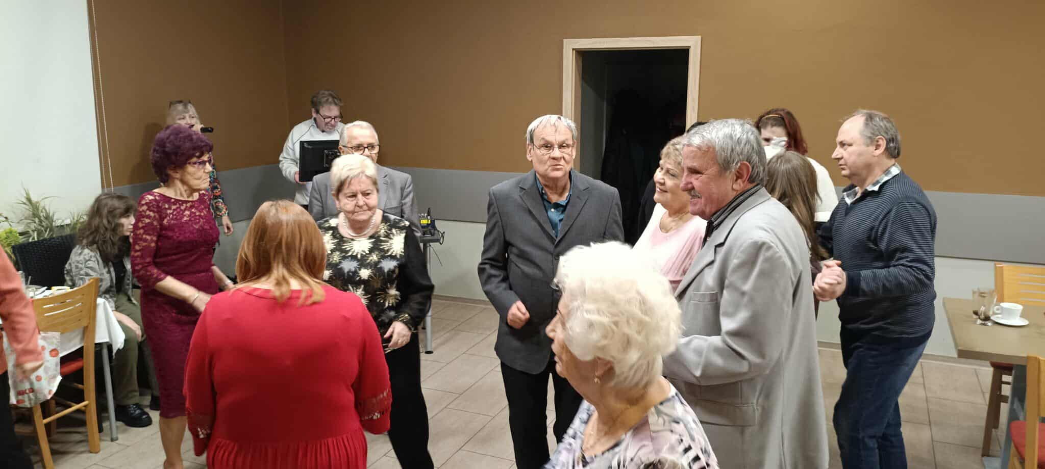 Popis fotografie: místnost plná lidí. V popředí i vzadu stojí starší muži a ženy, někteří spolu tančí, jiní si povídají. Oblečení mají slavnostní. V pozadí je vidět stůl a židle a také muž u notebooku, který pouští hudbu.