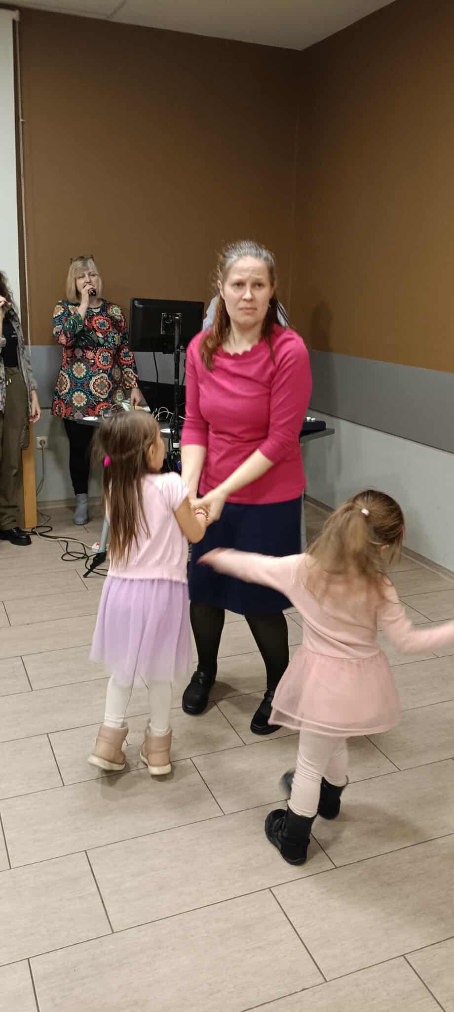 Popis fotografie: V místnosti tančí dospělá žena se dvěma malými děvčátky. Drží je za ruce a pohybují se v kruhu. Děvčátka mají světlé, pastelové šaty a legíny, žena růžový top a tmavou sukni. V pozadí stojí dvě další ženy u stolku s ozvučením
