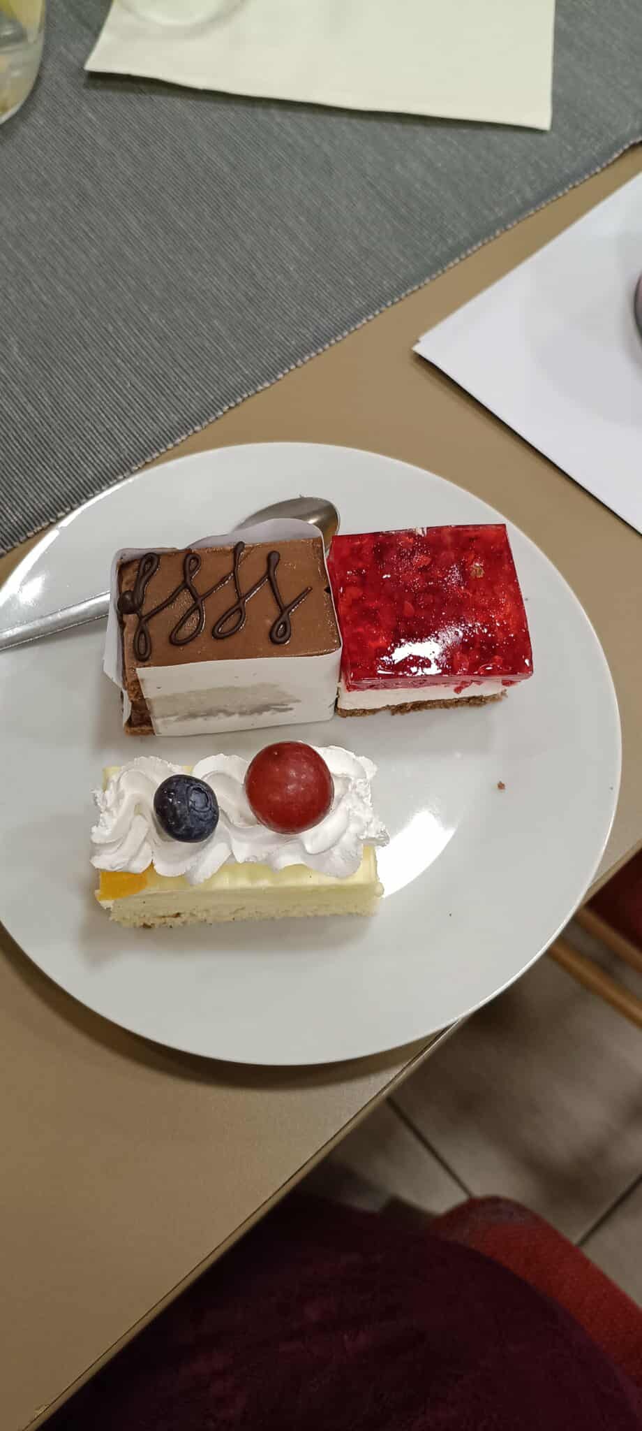 Popis fotografie: Na bílém talíři leží tři různé kousky dortu. Každý vypadá jinak: jeden má čokoládovou polevu, druhý je s červenou ovocnou vrstvou a třetí má žlutý krém, nahoře ozdobený šlehačkou, borůvkou a hroznem. Za dorty je položená lžička.