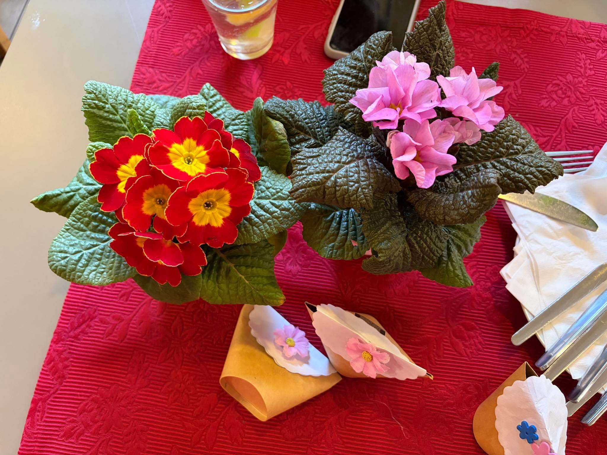 Na fotografii je červené prostírání na stole a na něm stojí dva květináče s malými petrklíči. Ten vlevo má červené květy se žlutým středem, ten vpravo má květy růžové