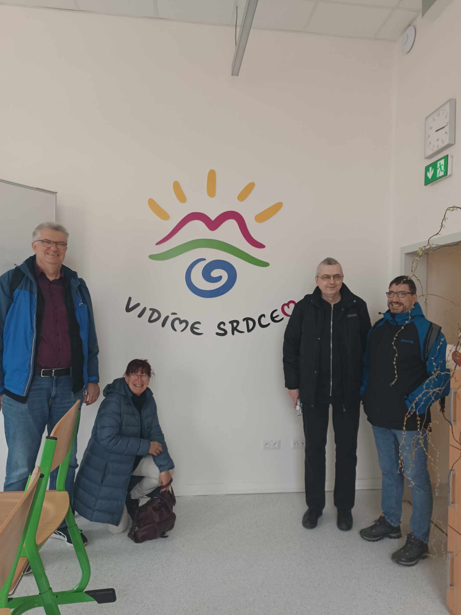 Popis fotografie: Tři stojící muži a jedna žena v podřepu jsou v místnosti před barevnou nástěnnou malbou se stylizovaným srdcem, sluncem a nápisem „Vidíme srdcem“.