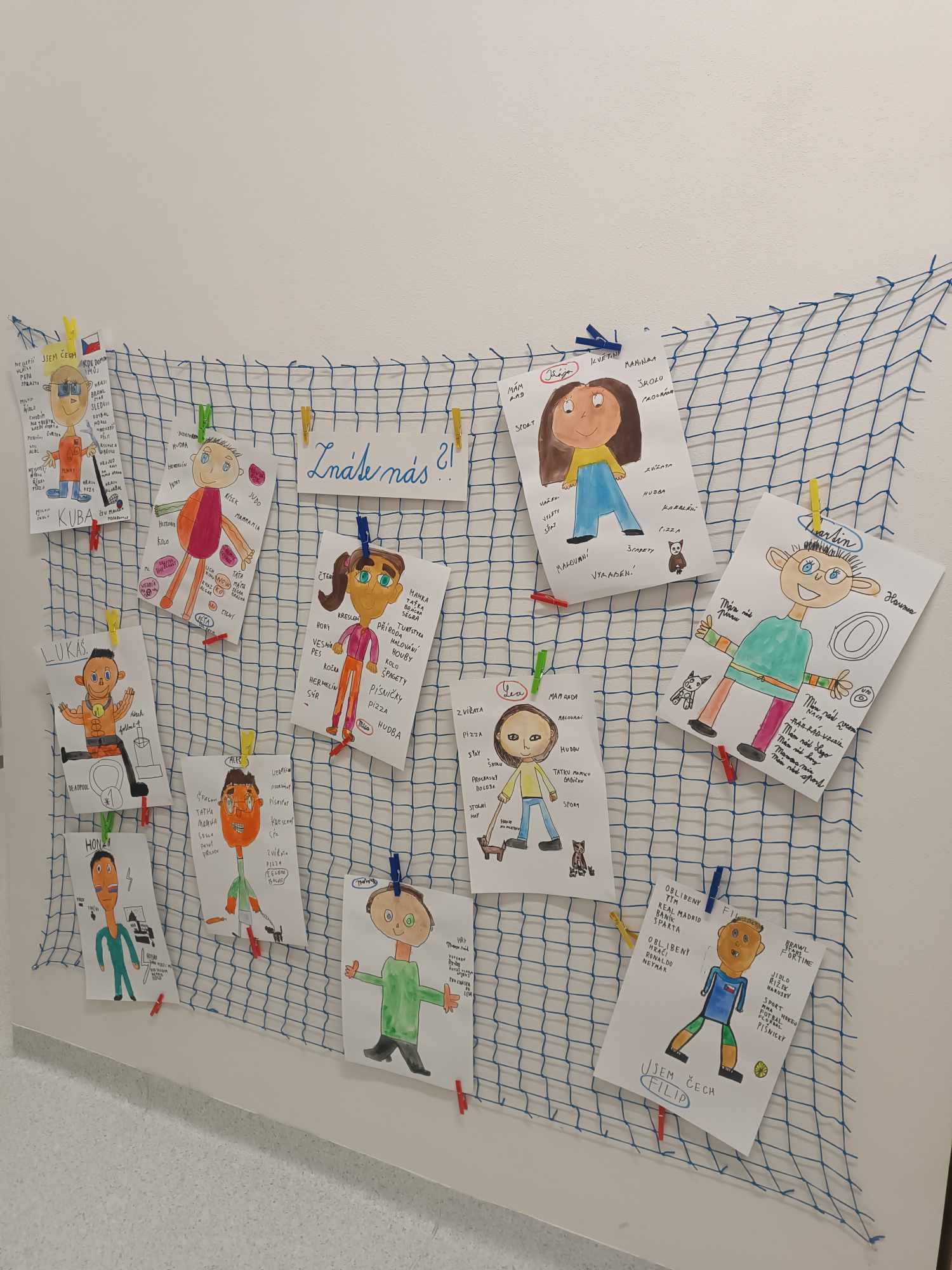 Popis fotografie: Na modré síti visí dětské kresby postav, každá s popisky o sobě. Uprostřed je ručně psaný nápis „Znáš nás?!“