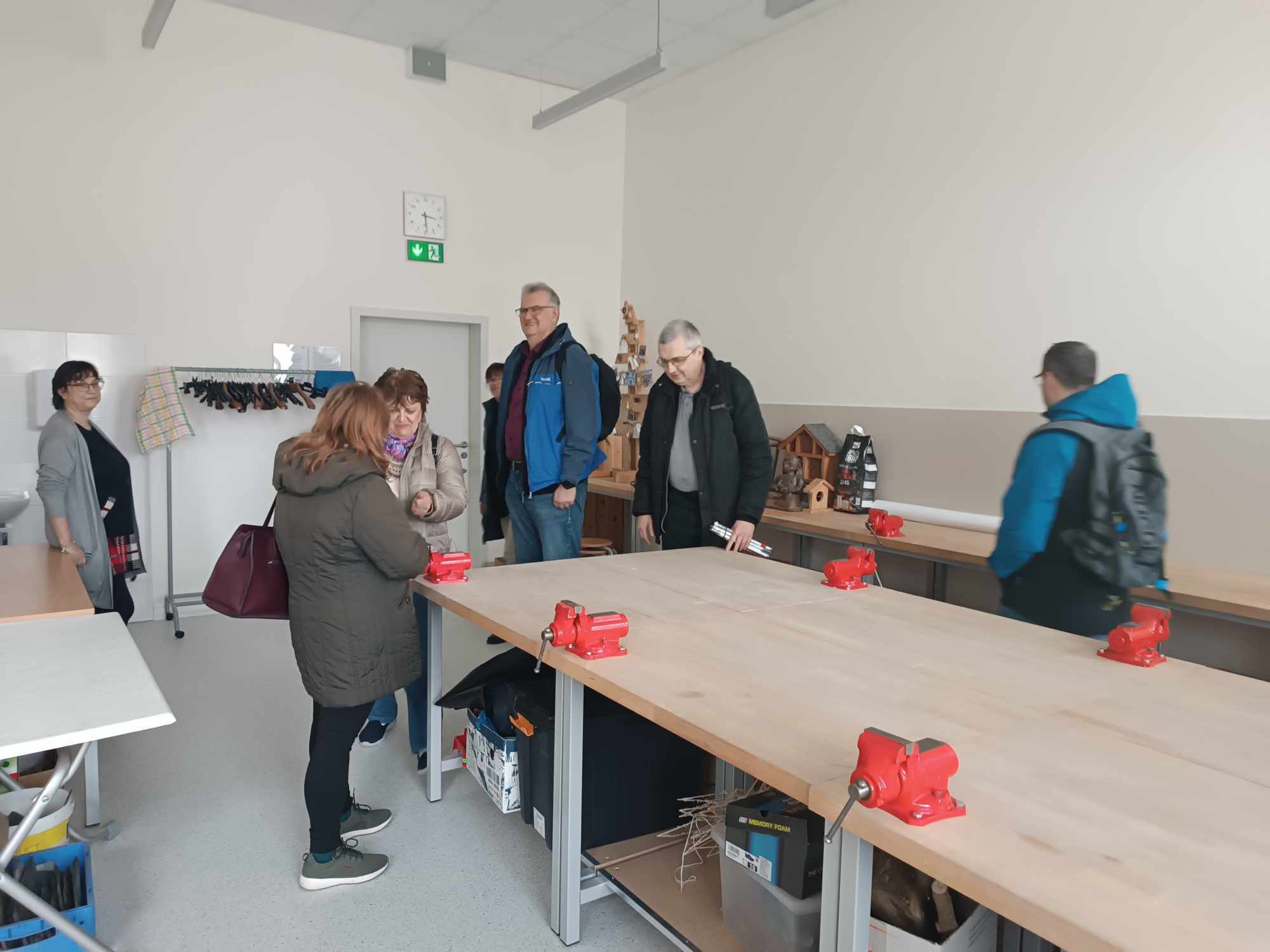 Popis fotografie: Skupina lidí stojí v dílně s velkými dřevěnými pracovními stoly a červenými svěráky. Na policích jsou malé dřevěné modely domků.