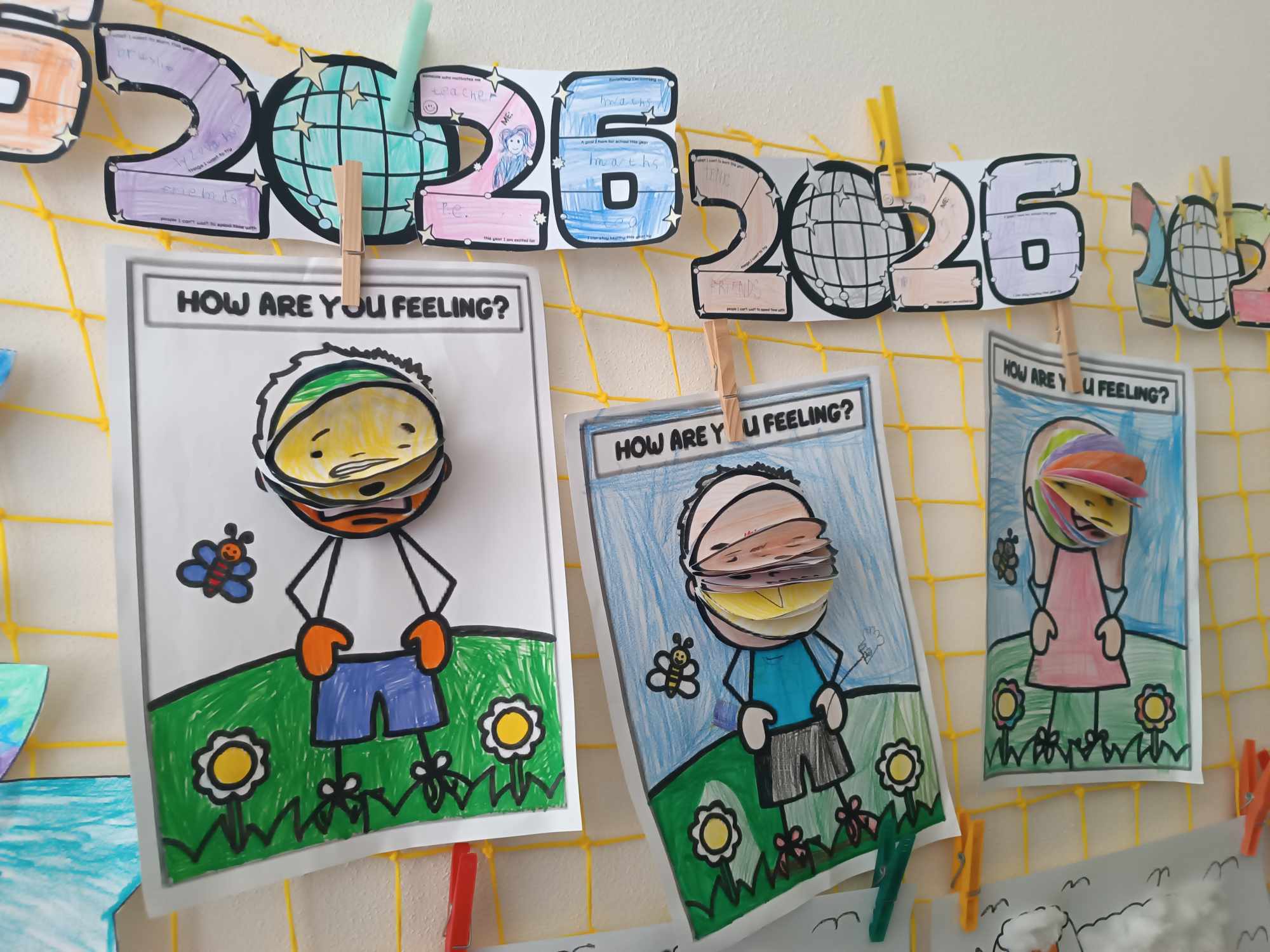 Popis fotografie: Na žluté síti visí dětské obrázky postaviček na trávě. Každá má papírový obličej, který lze otáčet podle nálady. Nad tím visí barevné číslice „2026“.