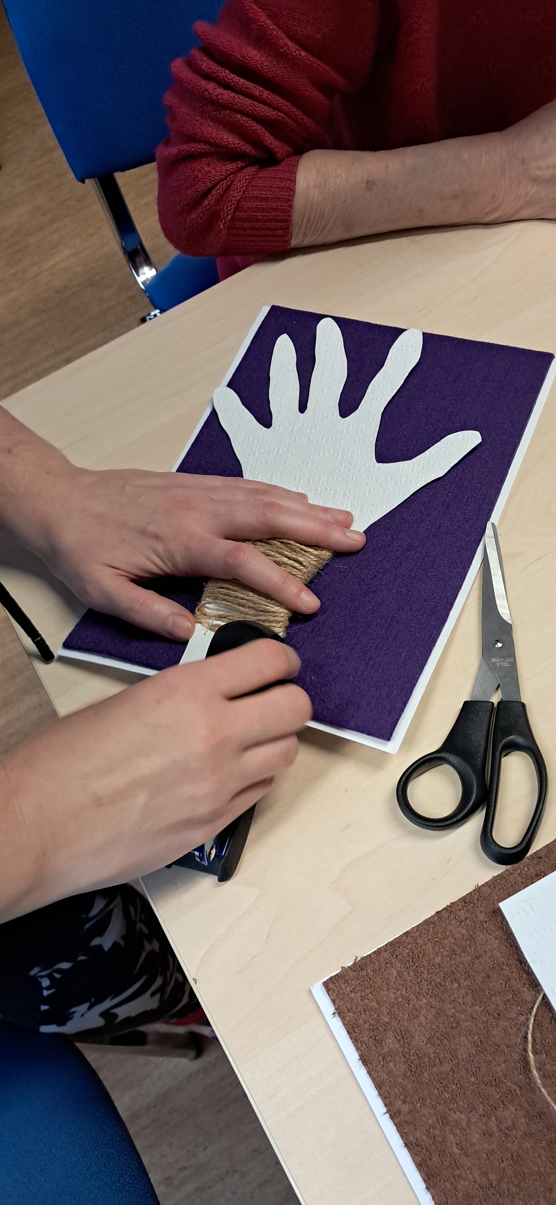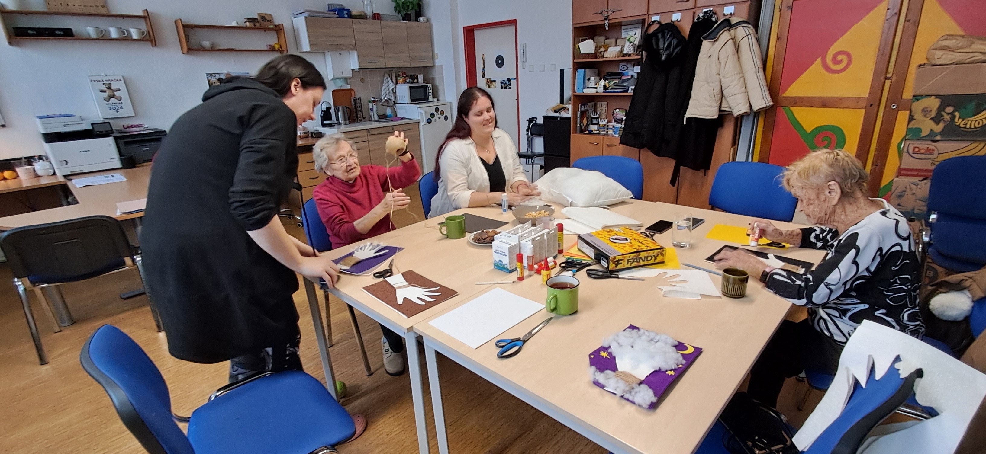 První tvoření letošního roku jsme pojali pozvolna. Vyráběly se hmatové obrázky se zimní tématikou. Kvůli špatnému počasí se nedostavilo tolik lidí, kolik jsme čekali, ale i přesto k nám někdo zavítal. Zmenšení počtu účastníků se vlastně ve výsledku vyplatilo, protože těm, kteří přišli, jsme se mohli intenzivněji věnovat. Věk účastnic se pohyboval kolem a lehce přes devadesát let, ale nebylo to poznat. Jednak jim patří obdiv, že se prodraly zasněženým městem, navíc dámy jsou pohotové, vtipné a šikovné. Už jen jejich přítomností bylo o zábavu postaráno.