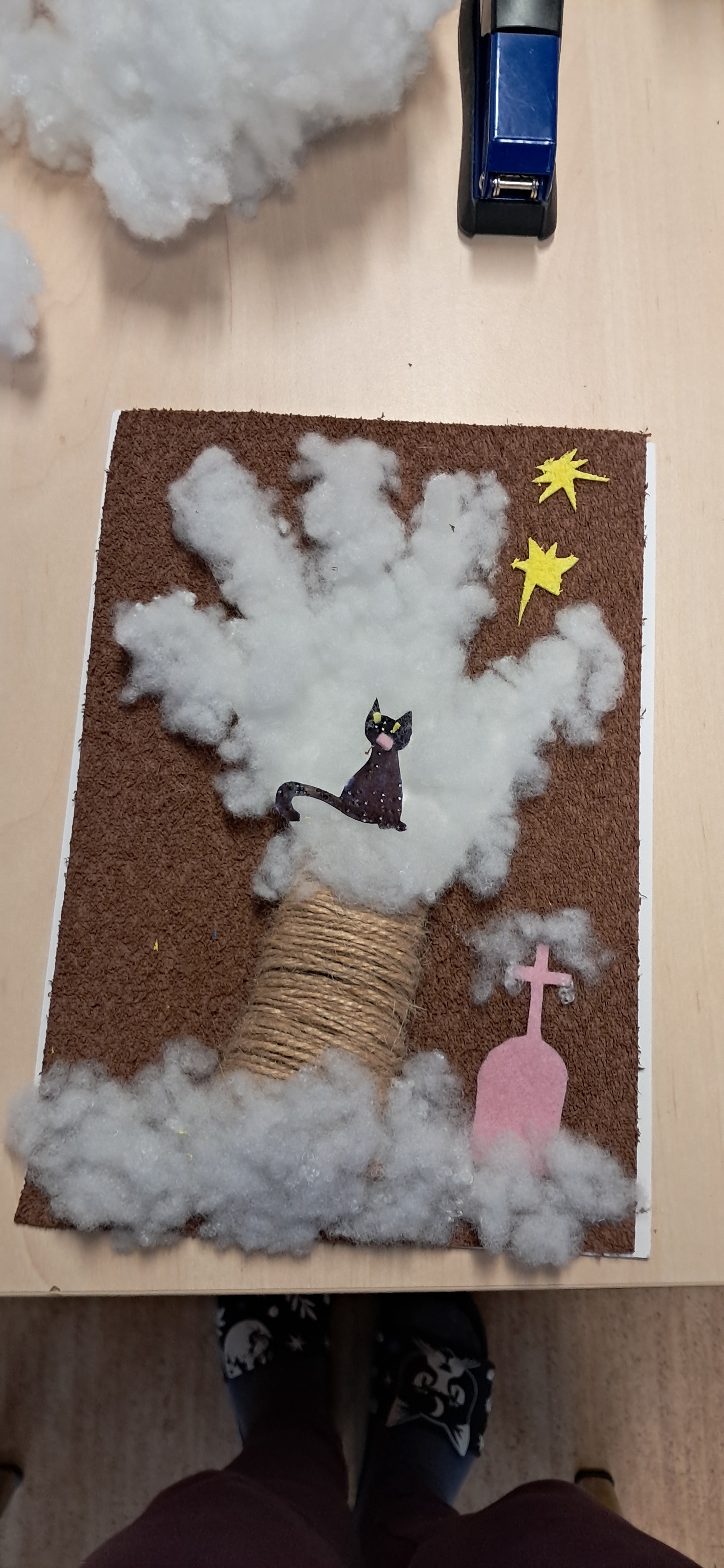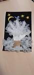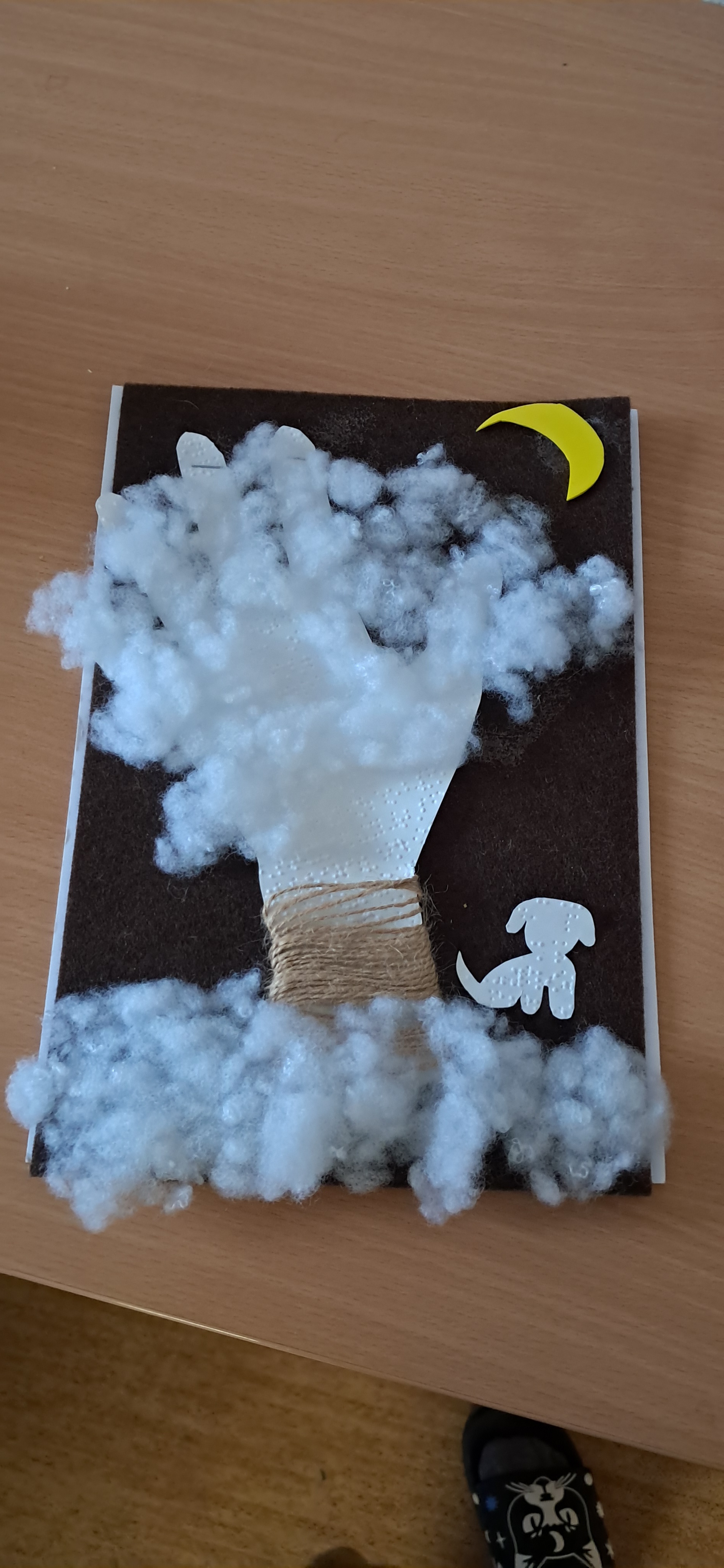 Hlavním motivem obrazu byl zasněžený strom. Ale aby to nebylo tak jednoduché, základem pro něj byl papírový výstřižek ruky včetně části zápěstí. Papír jsme použili braillský. Jako podklad sloužil barevný pěnový, nebo filcový arch A4. Na ten jsme ruku v oblasti prstů nalepili, nebo přicvakli sešívačkou. Zápěstí se omotalo provázkem, nebo lýkem. Vznikl tak kmen stromu. Prstíky tvořily větve. S použitím lepidla a vaty, nebo výplně z polštáře jsme vytvořili sníh. Nedílnou součástí obrázku byly i různé detaily. Ty si každý vybral sám. Volili jsme hvězdy, měsíc, zvířata, ale třeba i náhrobek, protože stromy rostou všude. Na tomto konkrétním sedí i kočka, protože kočky se cítí dobře tam, kde je ticho. Jinde u stromu sedí pes, někde nad korunou krouží pták.