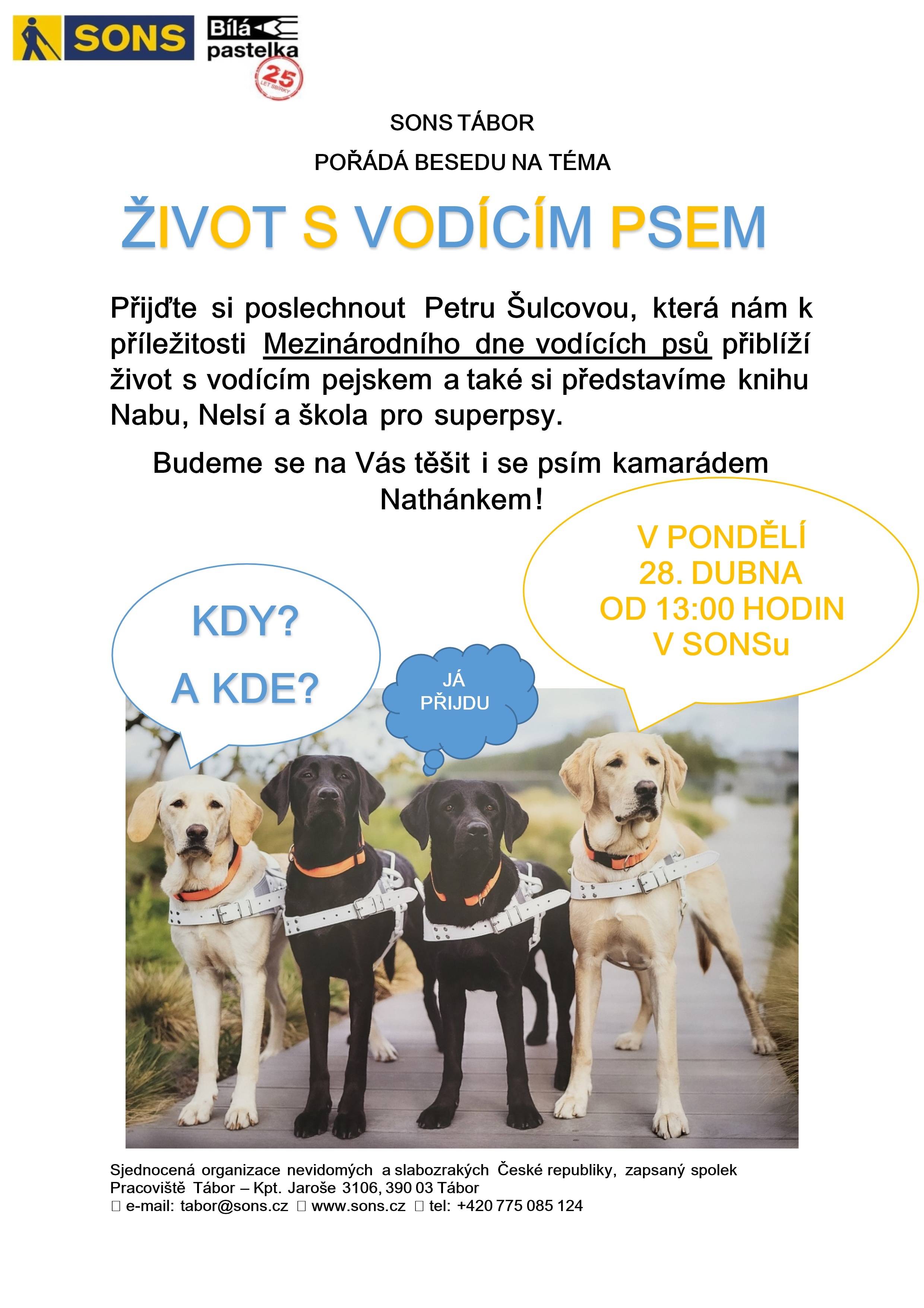 Přijďte si poslechnout Petru Šulcovou, která nám k příležitosti Mezinárodního dne vodících psů, přiblíží život s vodícím pejskem a také si představíme knihu Nabu, Nelsí a škola pro superpsy.