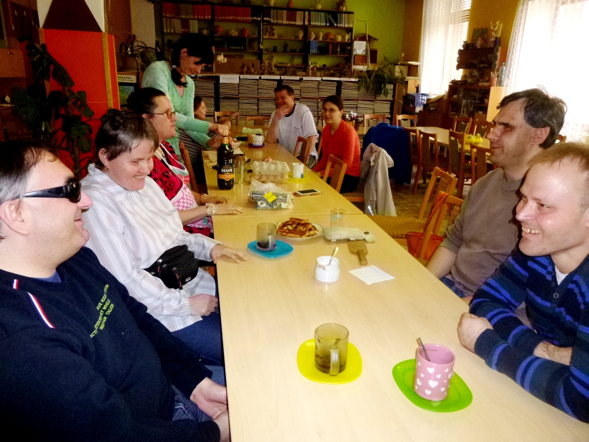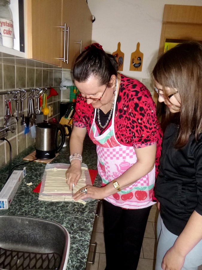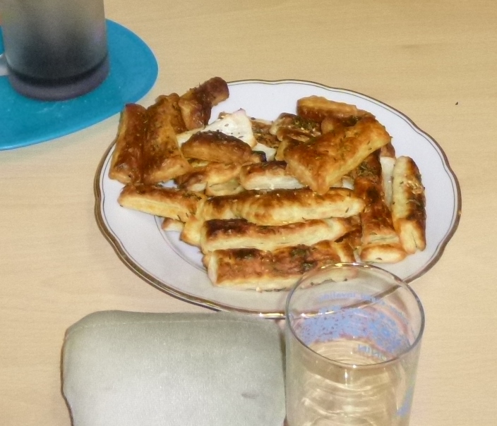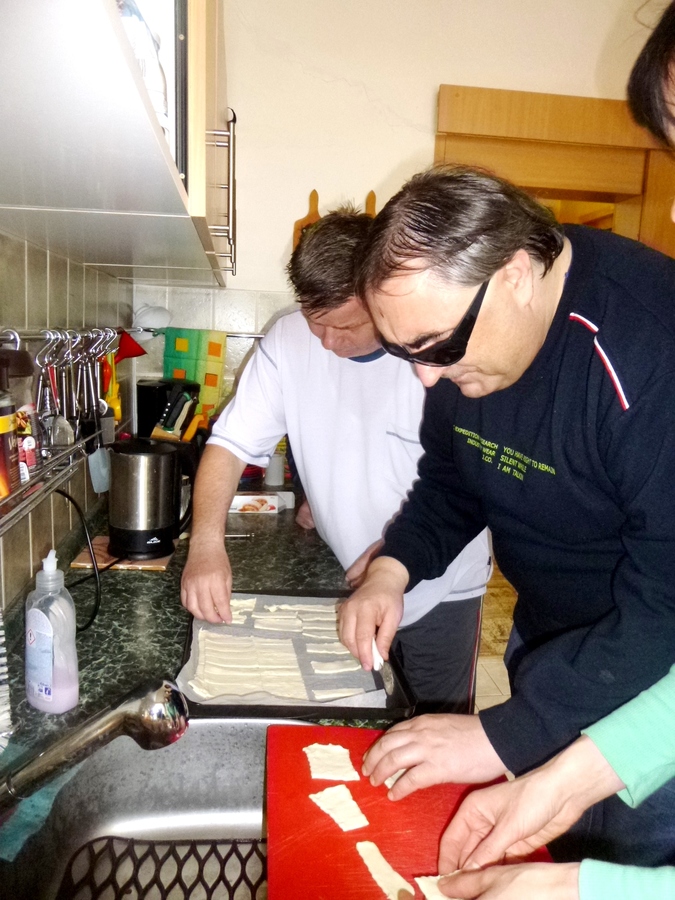 V rámci sebeobsluhy - tedy sebeobslužných úkonů, tedy procvičení běžných úkonů v běžném životě, dnes tvořil tým chlapů a tým děvčat výrobu slaných tyčinek z listového těsta. Zdá se to jednuchá záležitost, ale vše dělat poslepu??? Tak to je třeba osvojovat si krok za krokem a za pomoci asistence. Doma už budou frajeři :-)