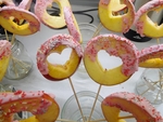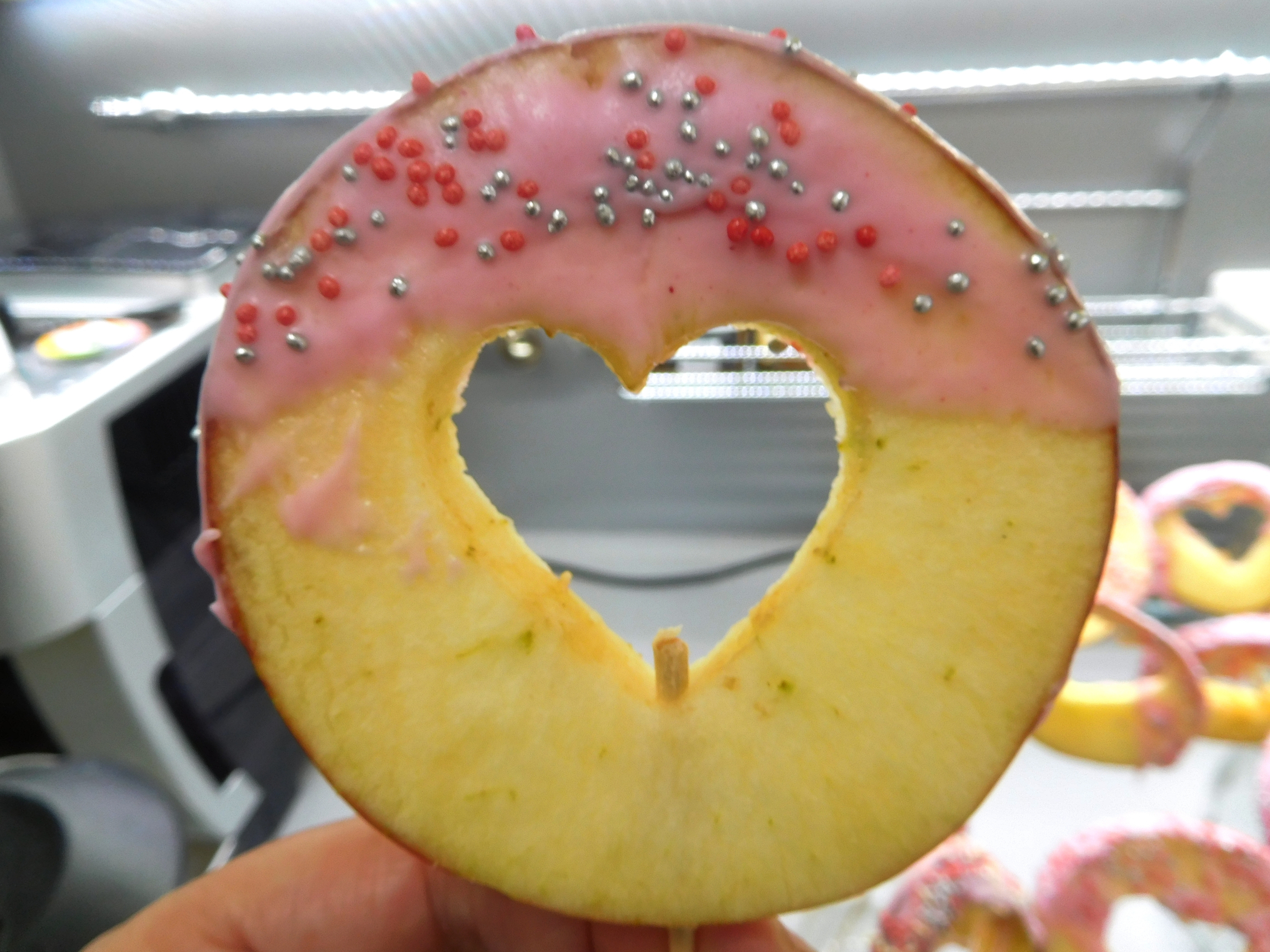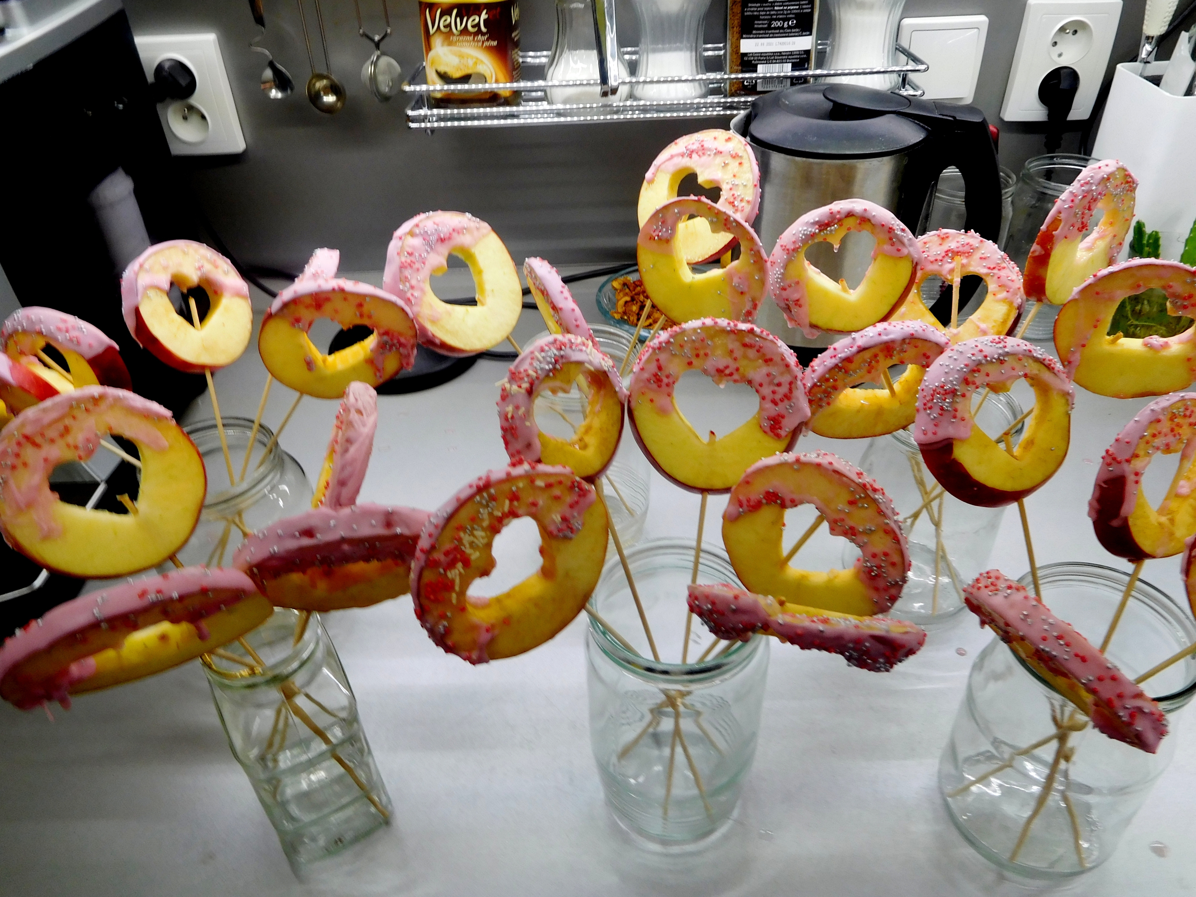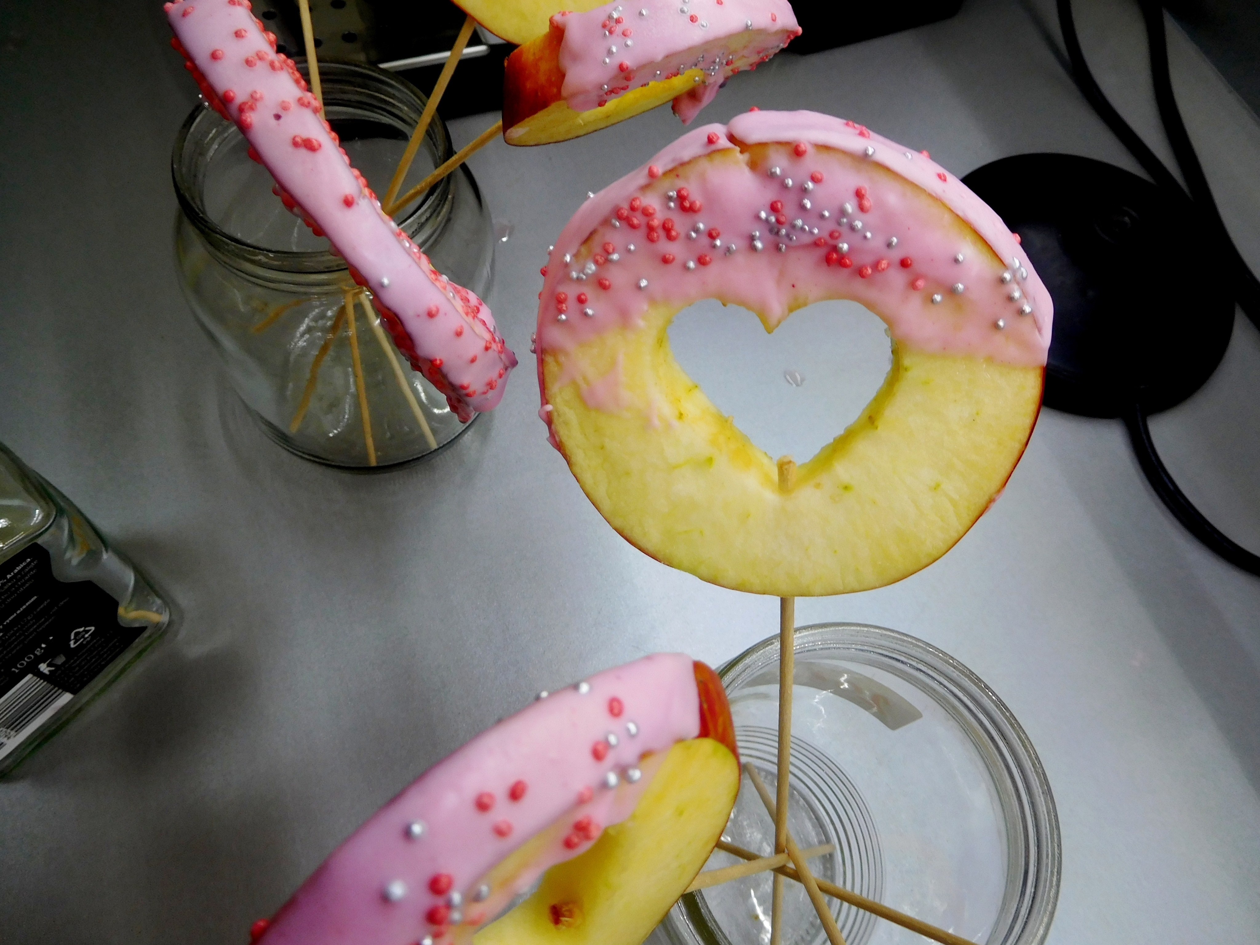 Opět něco do břiška. Sice,.... realita se hodně lišila od představy, ale chutilo a to bylo hlavní, i když na vodnatém jablíčku nám moc barevná, voňavá čokoláda z ozdůbkami nedržela, ale vykrojené srdíčko tam bylo!