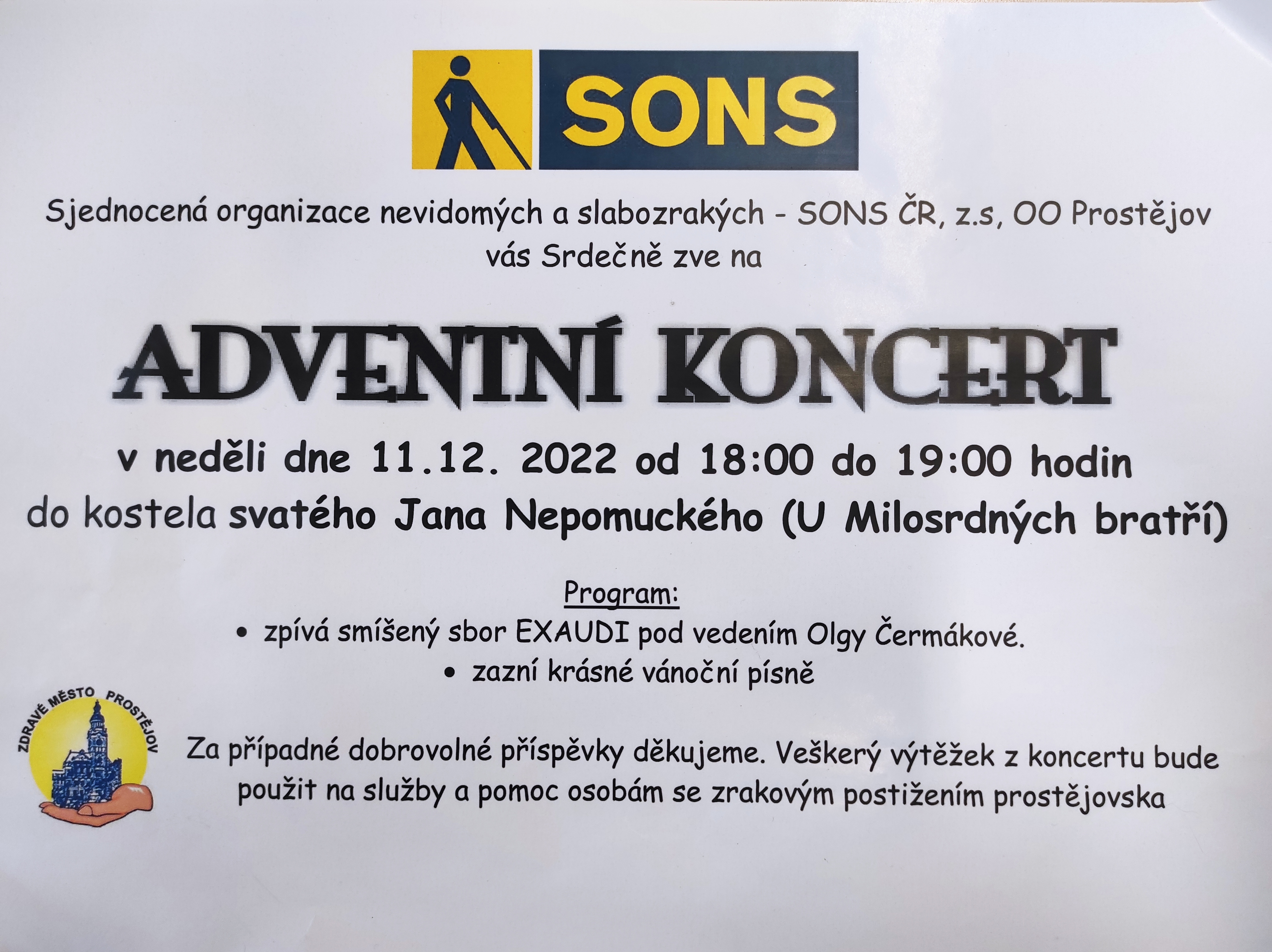 srdečně vás zveme na náš Adventní koncert. Přijďte si poslechnout vánoční písně, které v kostele pohladí váš sluch i duši. Bude to hodinka klidu a pohody v adventním čase. Na chvíli se zastavíte a řeknete si, že brzy budou Vánoce a poté vstoupíte do nového roku 2023. Přejeme vám vše dobré. Váš kolektiv SONS Lenka, Pavla, Boženka a Jaruška